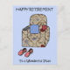 A comfortable looking, chintz patterned, armchair with a pair of slippers in front of it, accompanied by the words 'Happy Retirement to a Wonderful Vicar'.