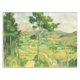 Victoire and the Viaduct of the Arc River Valley. Paul Cezanne. Landscape in green tones. in the foreground there is a tall pine tree. In the middle ground, a railway bridge runs across a wide field. Mountains in the background. Reproduction of famous works of art images in the public domain.