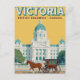 A charming vintage-style travel poster for Victoria, British Columbia, Canada. This artwork showcases the grand Parliament Building and a traditional horse-drawn carriage—iconic symbols of the city. The bold, yellow and teal palette gives the design a bright, retro feel. It's the perfect postcard for travel lovers, fans of Canadian scenery and history, or anyone collecting classic architecture and Art Deco-inspired designs.