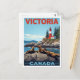 Send a beautiful piece of Canadian West Coast charm with this postcard! Inspired by classic mid-century travel posters, this illustration captures the sunny, vibrant atmosphere of Victoria, British Columbia. The design features a group of sea lions lounging on rocky shores in the foreground, with a striking red and white lighthouse visible on the cliffs above. The clean lines and bold colors perfectly evoke a nostalgic travel feel.