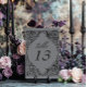 Elevate your gothic wedding with a Victorian-inspired wedding table number that exudes timeless elegance and mystery. Designed to resemble an antique book binding, this stunning design features intricate a black and grey lacey filigree, evoking the charm of a bygone era. Let your love story unfold with a table number card as unforgettable as your day. Created by Simply Farmhouse Press.
