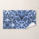Victorian pattern on towels in blue. Wash cloth and bath towel have the matching pattern in different sizes. The hand towel has a reverse of that pattern.