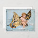 This enchanting postcard features a high-quality reproduction of a charming 19th-century Victorian greeting card design. An adorable, plump-cheeked baby Cupid or Angel with flowing golden curls is shown sitting regally upon the back of a majestic Giant Swallowtail Butterfly.