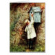 A beautiful vitorian painting of a little boy putting a letter in the mailbox. The big blue weathered wood mailbox is secured to a stone wall. The cute little boy is in traditional victorian garb and is reaching high on his tippy toes to complete his task. Very cute and charming and done in a rich colour scheme of greens, amber, blue and hues of grey.