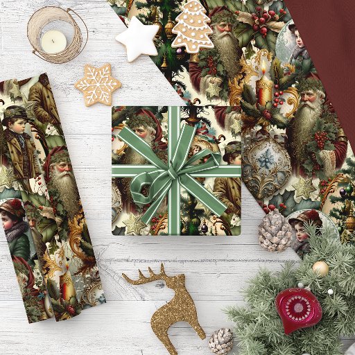 Transport yourself to a bygone era with our stunning Victorian Christmas wrapping paper design. This paper features the beloved Father Christmas, surrounded by Victorian children and delicate ornaments, all nestled within lush greenery.