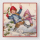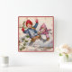 Holiday clock with a charming image of two children playing in the snow in early 1900s clothing.