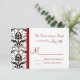 The elegant damask wedding invitation has a border of black and white damask along the left hand side of the invitation, and has a red stripe accenting the announcement. The font is the same colour as the stripe. Just add your RSVP date to the card.