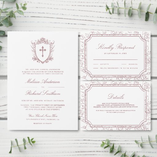Victorian Dusty Rose Catholic QR Code Wedding Invitation
