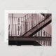A postcard with a warm toned telephoto digital photo of an enigmatic wrought iron Victorian fire escape photographed in Cardiff City Centre. Perhaps reminiscent of film noir, spy and crime thrillers. It seems to anticipate some kind of drama.