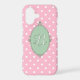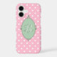 Vibrant colors, a Victorian frame and Rococo style details combine to create this cute, pink, girly phone case. An initial (in white text) sits center inside the green frame, while a bright pink and white polka dots pattern creates the background.