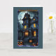 This spooky and captivating Halloween card features a chilling scene of a haunted house bathed in the eerie glow of a full moon. The towering, gothic mansion looms in the background with its windows ominously lit, casting an unsettling, yet intriguing light. Jack-o'-lanterns with sinister grins sit scattered on the front lawn, adding to the haunting atmosphere.