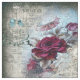 Victorian red rose floral featuring a faux pearl necklace and brooch, a birdcage with teal bow, on vintage newspaper print base in a mirrored image pattern creating a lovely quilt like pattern.