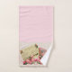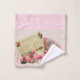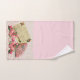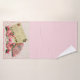 Elegant, Victorian pink towel set has an off white lacy paper doily over a gradient background from darker pink. A vintage post card and antique fan are displayed with a spray of lovely Victorian roses across the bottom. Transform your bathroom into pure Victorian romance!