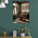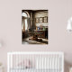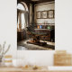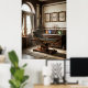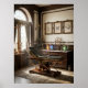 A refined Victorian medical atelier is reimagined as an elegant steampunk laboratory filled with polished brass instruments, glass vessels, and intricate mechanical devices. Warm metallic tones contrast with soft natural light streaming through tall windows, illuminating chrome fixtures and antique wood surfaces. The composition emphasizes precision, atmosphere, and craftsmanship, creating a cinematic environment rich in texture and detail. Subtle haze and deep shadows enhance the sense of mystery and sophistication. This artwork blends history and imagination into a luxurious interior scene, perfect for collectors drawn to industrial elegance and vintage science aesthetics.