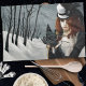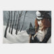 A captivating steampunk-inspired portrait set in a haunting winter landscape. A mysterious Victorian woman with flowing red hair stands among stark, leafless trees and drifting snow, her piercing gaze as cold as the season around her. Dressed in elegant black attire with a feathered top hat, she gently holds a mechanical dragonfly perched on her gloved hand, while a vintage key dangles like a secret waiting to be unlocked. This artwork blends gothic elegance, steampunk fantasy, and winter solitude, making it perfect for lovers of dark beauty, alternative fashion, and imaginative storytelling.