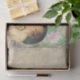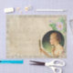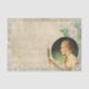 Victorian style young lady looking at herself in a mirror with a large pink flower and sheet music background tissue paper for gift wrapping and decoupage projects.