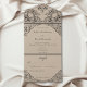 Elevate your gothic wedding with a Victorian-inspired all in one wedding invitation without dinner choices that exudes timeless elegance and mystery. Designed to resemble an antique book binding, this stunning design features intricate a black lacey filigree on a tan kraft paper-look background, evoking the charm of a bygone era. The wording, "Til Death Do Us Part" can be edited and changed, or deleted entirely, if you prefer. Let your love story unfold with an invitation as unforgettable as your day. Created by Simply Farmhouse Press.