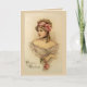 Beautiful Victorian woman holding a pale pink and red rose with "Valentine Greetings" in script.