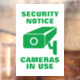 Video camera security service notice anti theft warning Window Cling. Static non adhesive sticker Window Cling. Custom signs for home, shops, museums, business, office, workplace, school, store, company, hospital and other public places. Make your own signage with secure symbol. Non adhesive. Sticks to window. Caution video monitoring surveillance sign for thieves, burglars, customers, clients, visitors, guests etc. Face outwards or inwards, printed on one side. Anti theft design displays. Green or custom colour.