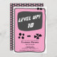 A fun, playful kids birthday party , perfect for video game and console player with a cute carton of a video game in editable pink and grey colour and square pixels pattern at the back.