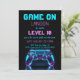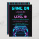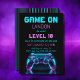 This cool stylish video gaming birthday party invitation features a neon glowing game controller design with typography and script font in teal and purple on a black background.. Perfect for celebrating a gamers birthday in style, this invitation is sure to impress your guests. Perfect for a boy or girl teen birthday parties. The invitation can be personalised to include your name, party details, and any other special information you want to include. Get ready to host the coolest video game party with this unique eye-catching invitation.