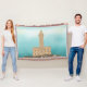 An illustration of Vieste lighthouse in Italy. This lighthouse is drawn standing on its Rocky Island. The theme of the lighthouse is lighting up the dawn or dusk sky. It is also known as Isola Santa Eufemia. It is located between the rocks of Santa Croce and San Francesco, just opposite the town of Vieste, Apulia,