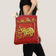 Golden Asian Paper-cut of an Ox into a square with the same design in black to create drop shadow. Design on all-over printed tote bag with golden wishes in Vietnamese + traditional pattern in red as background. Matching greeting card, Holidays postcard, invitation, craft supplies, party supplies and more... Perfect for Vietnamese New Year of the Ox 2021.