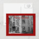 black and white photograph and red border of a street scene in the Vieux Quebec, Canada
