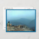 A hiker has climbed to a rocky outcrop on Mt. Crawford in the White Mountains of New Hampshire. She can see misty blue mountains and wilderness for miles and miles. This fine art photography postcard captures the wonder, magnificence and exhilaration of mountain climbing.