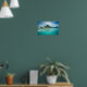 Poster print of a luxury overwater thatched roof bungalow resort in a vacation resort in the clear blue lagoon with a view on the tropical island of Bora Bora, near Tahiti, in French Polynesia.