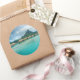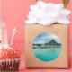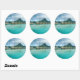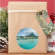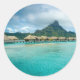 Round photo sticker with a luxury overwater thatched roof bungalow resort in a vacation resort in the clear blue lagoon with a view on the tropical island of Bora Bora, near Tahiti, in French Polynesia.