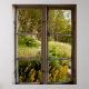 Yellow flowers, green grass and trees. Beautiful nature outside an old window. Photography.