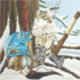 Norwegian Forest cat sitting by a tree with a blue dragon sit-in a a bottle helmet. Snow all around them, sword and viking axe with them.