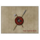 A 3d rendering of a Viking shield along with a battle axe and spear superimposed on an old paper or parchment background image. The shield is decorated with a black raven (Corvus corax) painted on red leather. Add your own text.