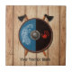 Rauð hönd ok örn. A Viking shield and crossed battle axes superimposed on a wooden plank wall background image. The shield is black on the left side with a red right hand print. The other side of the shield is blue with a white eagle in Celtic-Norse style. Customise by adding your own text.