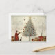 This whimsical village Christmas tree with presents and a cat is printed on a postcard. AI assisted graphic purchased with commercial use. Artwork: DelightfulDigiArt
