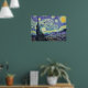 Vincent Van Gogh The Starry Night. This is an old masterpiece from the dutch master painter Vincent Van Gogh was a dutch post impressionist painter. Night Landscape. There is a tree in the foreground. The city is in the middle ground. Mountains in the background. There is a moon in the sky. stars and clouds. This image is in the public domain.