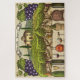 30" x 20" Puzzle with vineyard, wine bottles, glasses, barrel and corkscrew. Wine types text pattern behind bottles and banner with grapes at top reads "Wine a little - Laugh a lot". 1014 pieces.