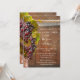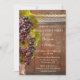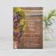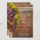 A romantic engagement party invitation featuring grapevines with lace and rope on a wood wine barrel background.