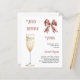 A modern, stylish and glamourous invitation for a Vino before Vows Bridal Shower. A white background with a pink bow, glass with bubbles and pearls. The name is written with a modern hand lettered style script. Personalise and add your party details.