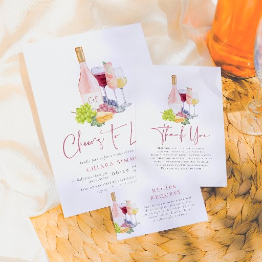 Celebrate the bride-to-be with our "Vino Before Vows" wine bridal shower invitation. The chic design showcases a watercolor illustration of a rosé bottle, champagne glass, red wine glass, white wine glass, grapes, cheese, and a vine leaf, creating an elegant and sophisticated theme for your wine tasting, charcuterie board, or brunch and bubbly bridal shower. The invitation reads "Vino Before Vows!" in chic calligraphy script lettering, adding a touch of modernity to the design. Personalise the wine bottle label with the couple's initials to make the invitation even more special. Cards reverse to an elegant botanical pattern against a pink background. Raise a glass to the future Mrs. with our "Vino Before Vows" invitation! Perfect for a winery or vineyard bridal shower, or bridal brunch event. Customise the invitation using Zazzle's Design Tool, and choose between digital or printed invitations. Browse our store for more unique bridal shower invitations!