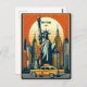 • This vibrant, retro-style postcard celebrates the iconic New York City, featuring the Statue of Liberty, the towering Empire State Building, and classic yellow taxis cruising along the waterfront.