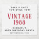 Fun liquor bottle labels for his 40th birthday party. Personalise the "Take a Shot He's Still Hot" text if desired, "Vintage" with the year he was born, his name and the party date.
