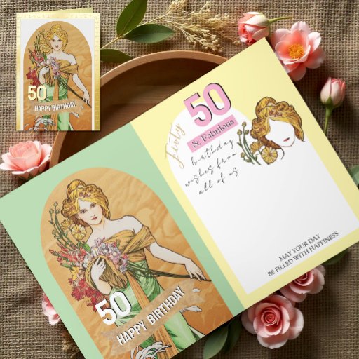 Fabulous 50 Vintage Birthday Party Invitation featuring Spring by Alphonse Mucha. The Spring Goddess carrying beautiful flowers with hair of golden sunshine. Stunning invitation card for your party. Age and texts can be easily adjusted.