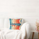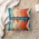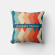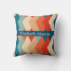 The design showcases a retro-inspired geometric pattern reminiscent of the 1960s, featuring a bold array of elongated diamond shapes in a palette of navy blue, coral red, teal, beige, and cream. These diamonds are arranged in a symmetrical, interlocking fashion that creates a striking visual impact through both shape and colour contrast. Each diamond shape is solidly filled with one of these colours, creating a bold and vibrant contrast that is both eye-catching and elegant. The repetitive and angular nature of the pattern imparts a sense of rhythm and movement, while the colours are chosen to evoke warmth and depth. This design would add a stylish and modern touch to any interior, making it an excellent choice for a decorative pillow for your home.