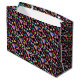 This design is a vibrant and playful pattern filled with 80s and 90s pop culture icons. It features a mix of retro gadgets and accessories, including a cassette tape, a boombox, a rotary phone, a vintage cell phone, a pair of headphones, a game console, sunglasses, and a roller skate. The background is a colourful mix of zigzags, hearts, and stars, creating a fun and dynamic aesthetic. The image evokes a sense of nostalgia and playful energy, reminiscent of a bygone era of vibrant colours and bold designs.