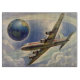 Vintage illustration travel and transportation design featuring a Douglas DC-7, four-engined, commercial, propeller aircraft. flying around the world. Fluffy white clouds in the sky high above the earth.