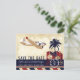 A vintage inspired postcard save the date for a travel themed wedding. Shown in shades of navy blue, dark red, white and light brown. Customise with your names, wedding date and wedding destination!