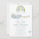 Celebrate your little one on the way with this cute, customizable baby shower invitation! This watercolor design features a fun vintage airplane in soft baby blue and yellow colors pulling along a party banner that spells out "boy!". A beautiful rainbow of green, blue and yellow arches soar above white puffy clouds.