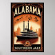 • This vintage-inspired Alabama travel poster features a classic riverboat cruising down a tranquil waterway. Musical notes float above the riverboat, capturing the spirit of Southern jazz culture. This poster brings to life the charm of Alabama's musical heritage and riverboat history, making it an ideal addition to any space that celebrates Southern culture.